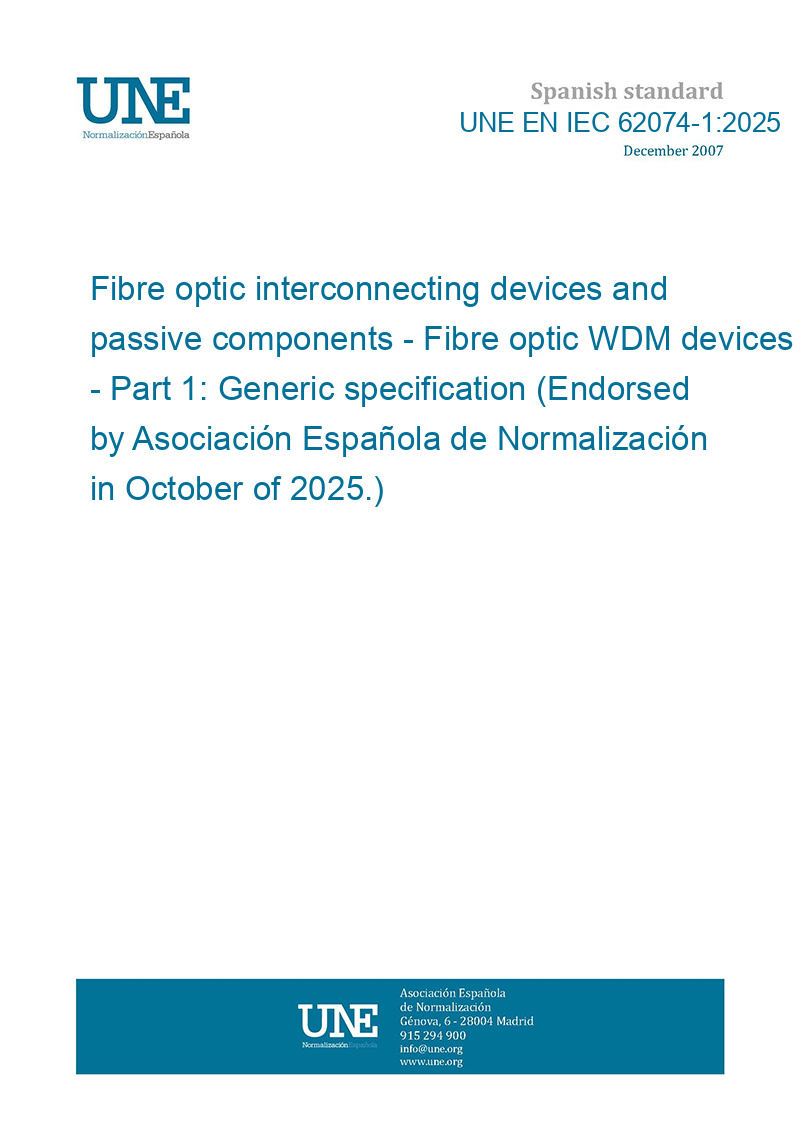 Dispositivos de interconexión de fibra óptica y componentes pasivos. Dispositivos de fibra óptica WDM. Parte 1: Especificación genérica. (Ratificada por la Asociación Española de Normalización en octubre de 2025.)