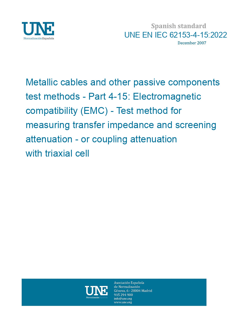 Métodos de ensayo de cables metálicos y otros componentes pasivos. Parte 4-15: Compatibilidad electromagnética (CEM). Método de ensayo para medir la impedancia de transferencia y la atenuación de apantallamiento o atenuación de acoplamiento con una celda triaxial.