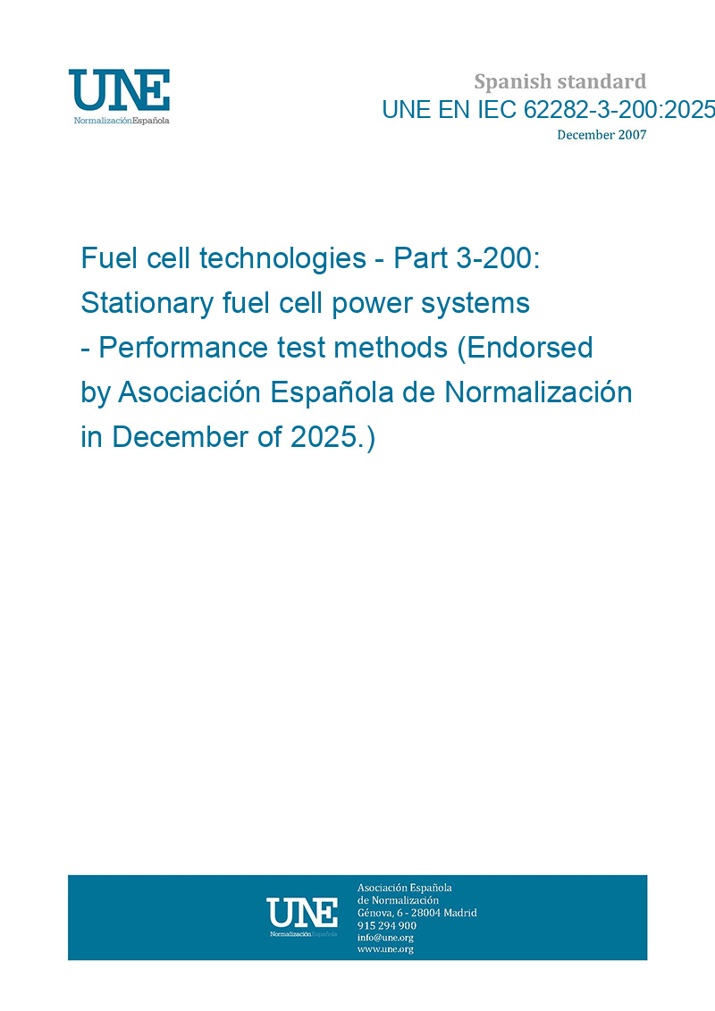 Tecnologías de pilas de combustible. Parte 3-200: Sistemas estacionarios de generación de energía por pila de combustible. Métodos de ensayo del rendimiento (Ratificada por la Asociación Española de Normalización en diciembre de 2025.)