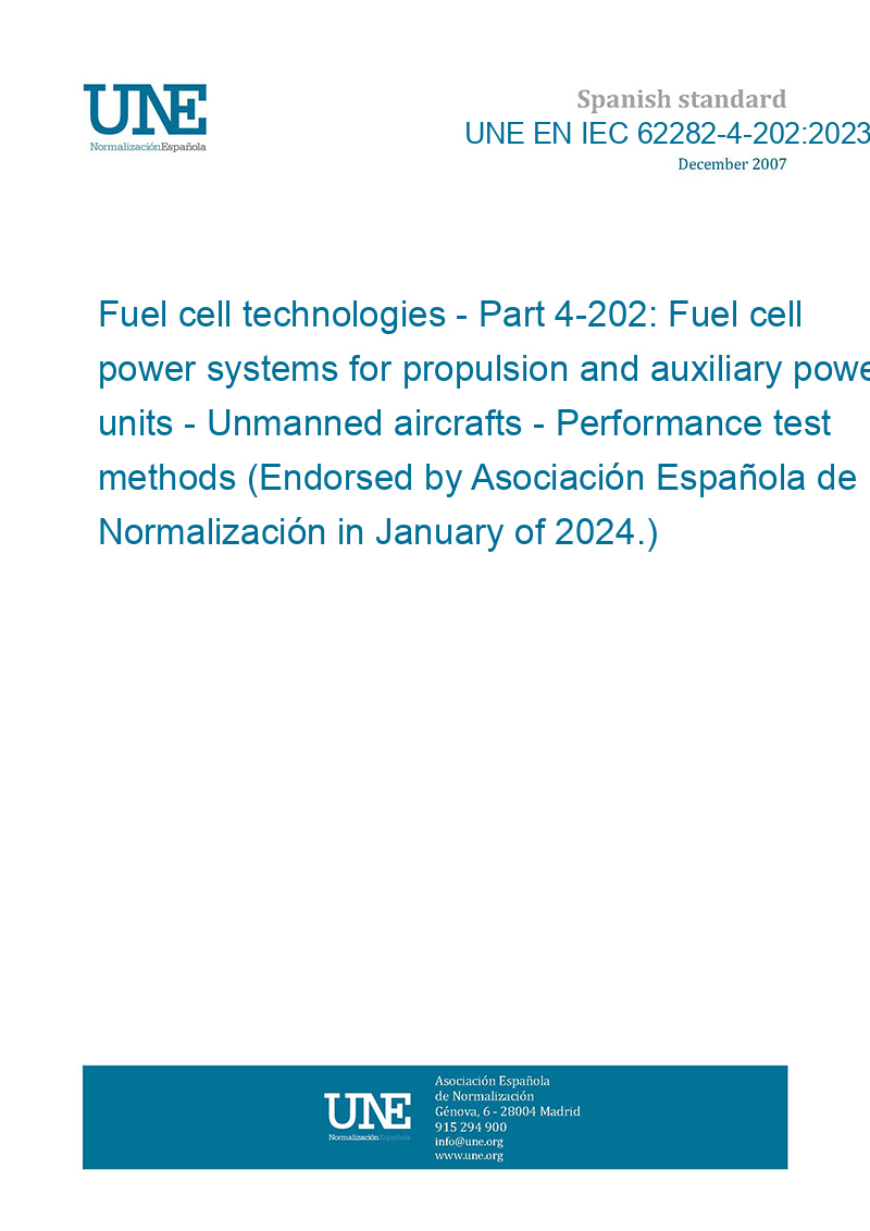 Tecnologías de pilas de combustible. Parte 4-202: Sistemas de alimentación de pilas de combustible para aeronaves no tripuladas. Métodos de ensayo del rendimiento. (Ratificada por la Asociación Española de Normalización en enero de 2024.)