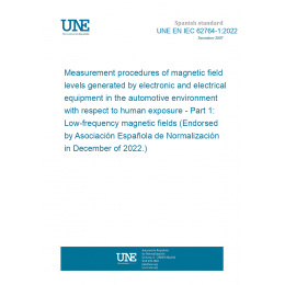 This standard UNE EN IEC 62764-1:2022 Measurement procedures of magnetic field levels generated by electronic and electrical equipment in the automotive environment with respect to human exposure - Part 1: Low-frequency magnetic fields (Endorsed by Asociación Española de Normalización in December of 2022.) is classified in these ICS categories: