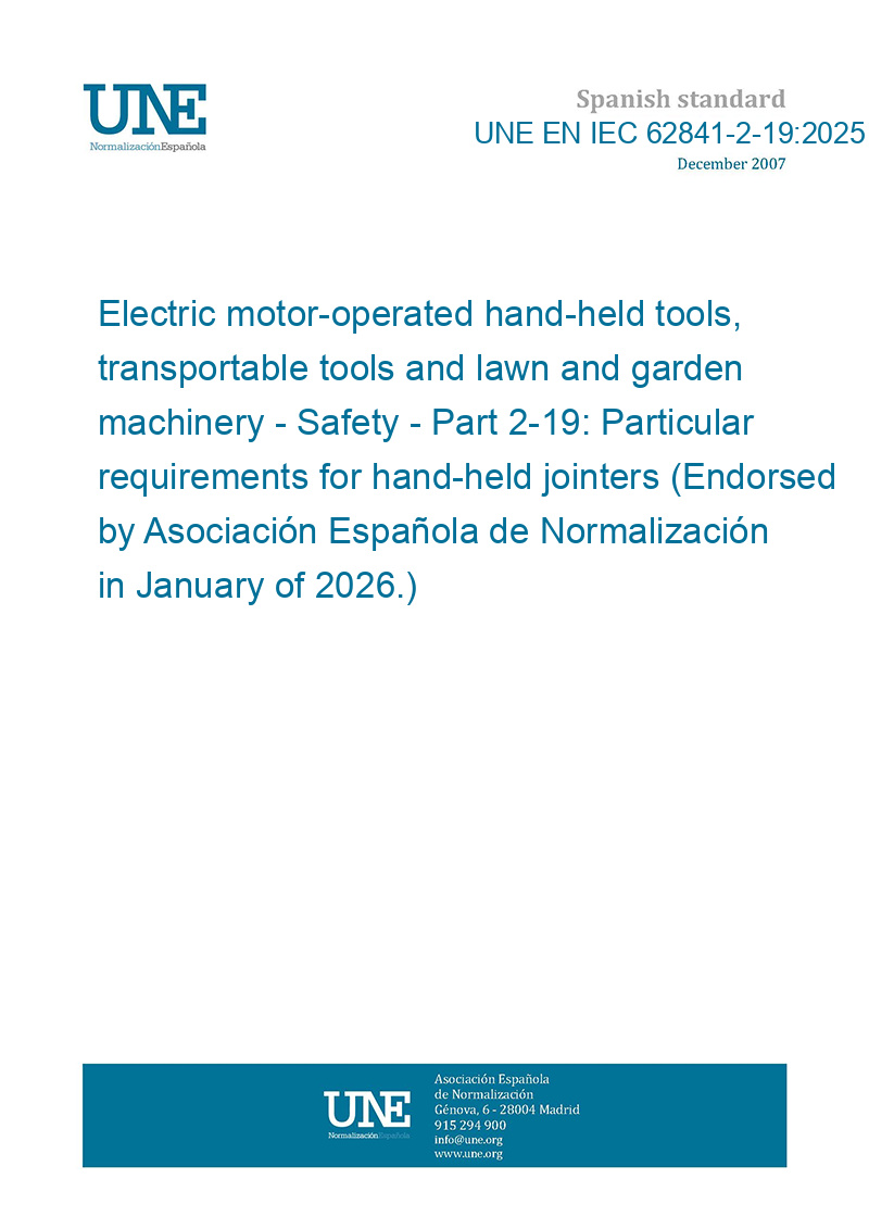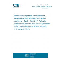 Electric motor-operated hand-held tools, transportable tools and lawn and garden machinery - Safety - Part 2-19: Particular requirements for hand-held jointers (Endorsed by Asociación Española de Normalización in January of 2026.)