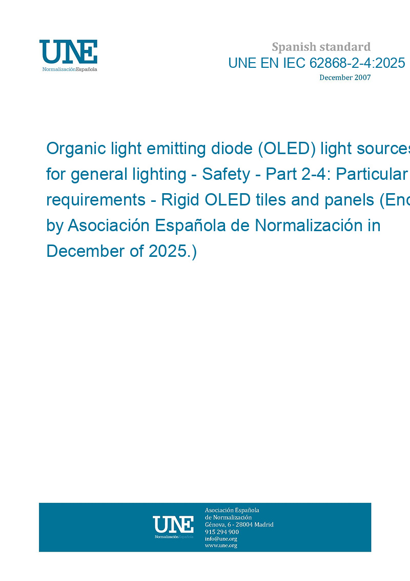 Paneles de diodos orgánicos emisores de luz (OLED) para iluminación general. Seguridad. Parte 2-4: Requisitos particulares. Placas y paneles OLED rígidos. (Ratificada por la Asociación Española de Normalización en diciembre de 2025.)