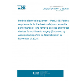 Medical electrical equipment - Part 2-58: Particular requirements for the basic safety and essential performance of lens removal devices and vitrectomy devices for ophthalmic surgery (Endorsed by Asociación Española de Normalización in November of 2024.)