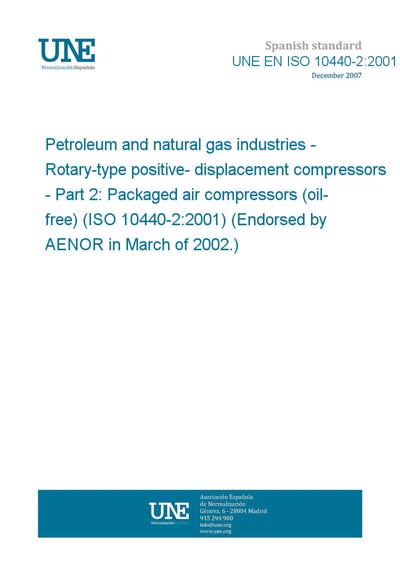 Petroleum and natural gas industries - Rotary-type positive- displacement compressors - Part 2: Packaged air compressors (oil- free) (ISO 10440-2:2001) (Endorsed by AENOR in March of 2002.)