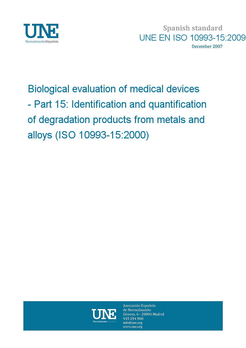 UNE EN ISO 10993-15:2009 Biological evaluation of medical devices - Part 15: Identification and quantification of degradation products from metals and alloys (ISO 10993-15:2000)