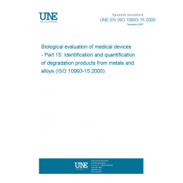 >UNE standards>UNE EN ISO 10993-15:2009 Biological evaluation of medical devices - Part 15: Identification and quantification of degradation products from metals and alloys (ISO 10993-15:2000)