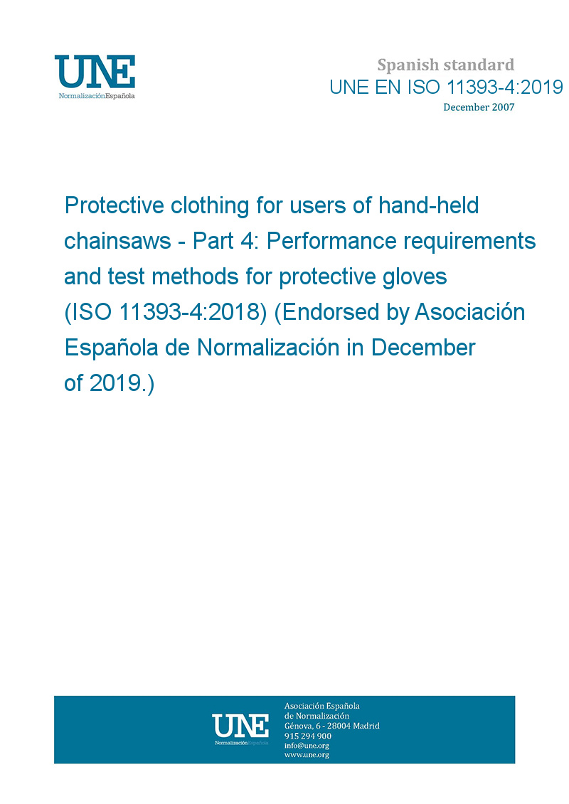Ropas de protección para usuarios de sierras de cadena accionadas a mano. Parte 4: Métodos de ensayo y requisitos para guantes de protección. (ISO 11393-4:2018) (Ratificada por la Asociación Española de Normalización en diciembre de 2019.)