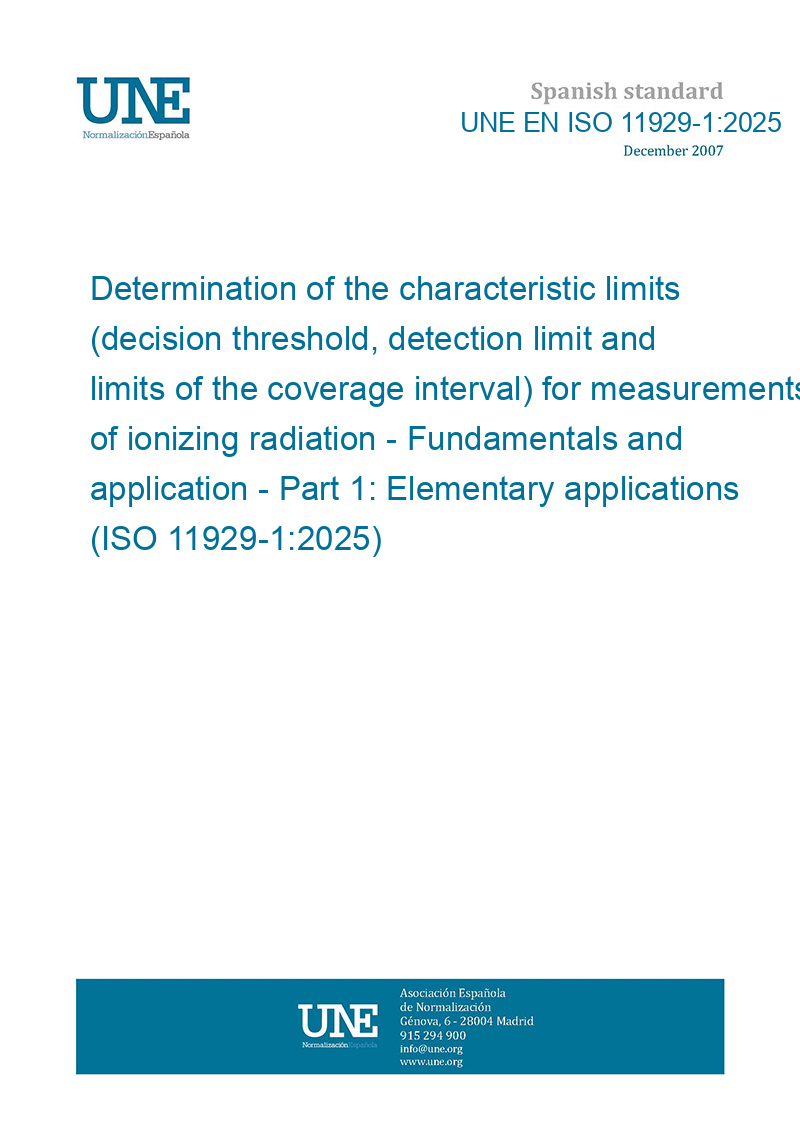 Determinación de los límites característicos (umbral de decisión, límite de detección y límites del intervalo de cobertura) para mediciones de radiación ionizante. Fundamentos y aplicación. Parte 1: Aplicaciones elementales. (ISO 11929-1:2025) (Ratificada por la Asociación Española de Normalización en febrero de 2026.)