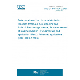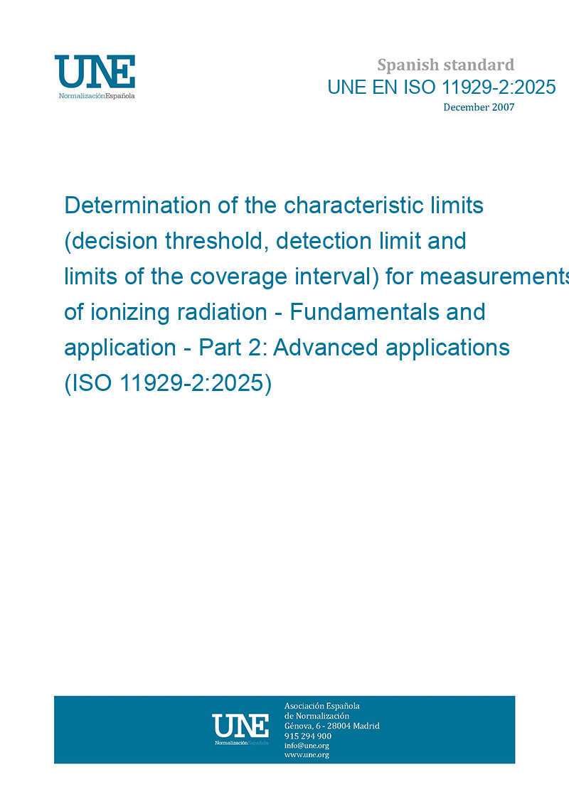 Determinación de los límites característicos (umbral de decisión, límite de detección y límites del intervalo de cobertura) para mediciones de radiación ionizante. Fundamentos y aplicación. Parte 2: Aplicaciones avanzadas. (ISO 11929-2:2025) (Ratificada por la Asociación Española de Normalización en febrero de 2026.)