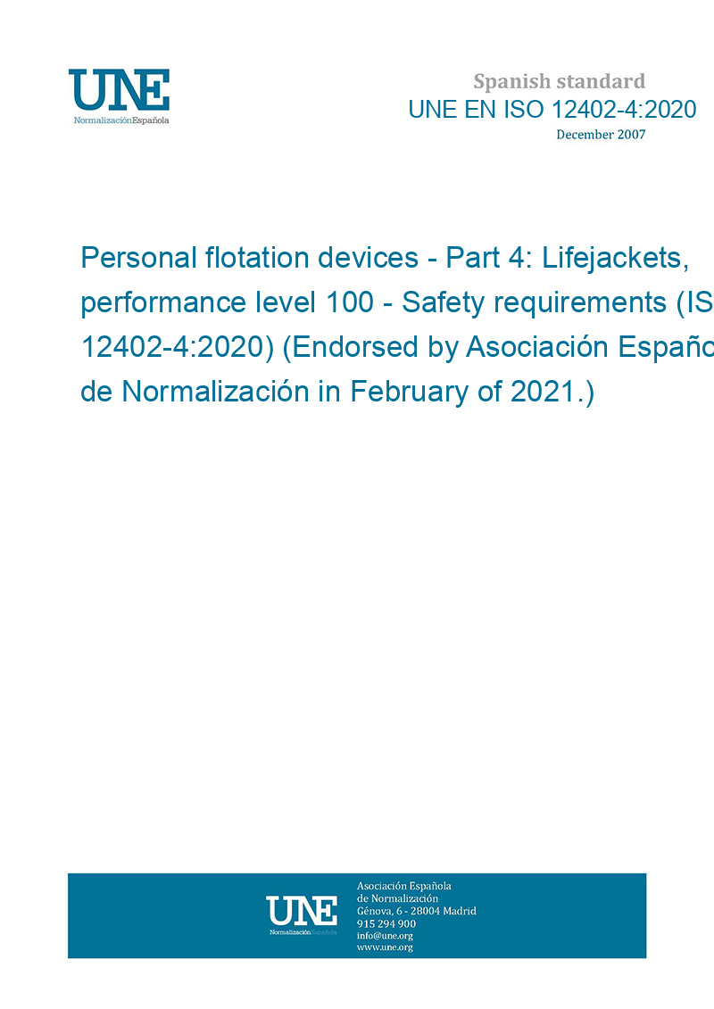 Personal flotation devices - Part 4: Lifejackets, performance level 100 - Safety requirements (ISO 12402-4:2020) (Endorsed by Asociación Española de Normalización in February of 2021.)