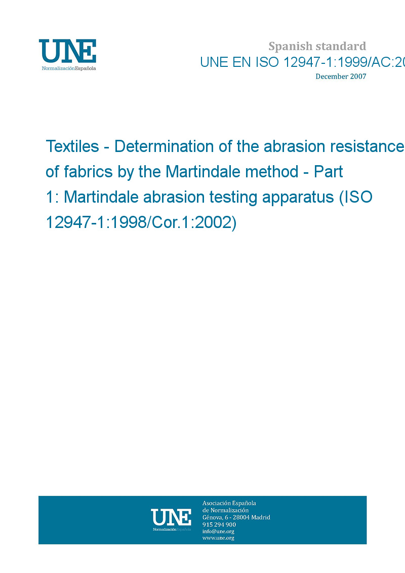 Textiles. Determinación de la resistencia a la abrasión de los tejidos por el método Martindale. Parte 1: Aparato de ensayo de abrasión de Martindale. (ISO 12947-1:1998/Cor.1:2002).