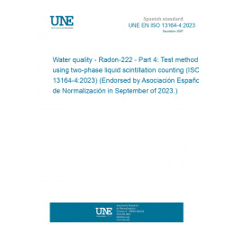 Water quality - Radon-222 - Part 4: Test method using two-phase liquid scintillation counting (ISO 13164-4:2023) (Endorsed by Asociación Española de Normalización in September of 2023.)