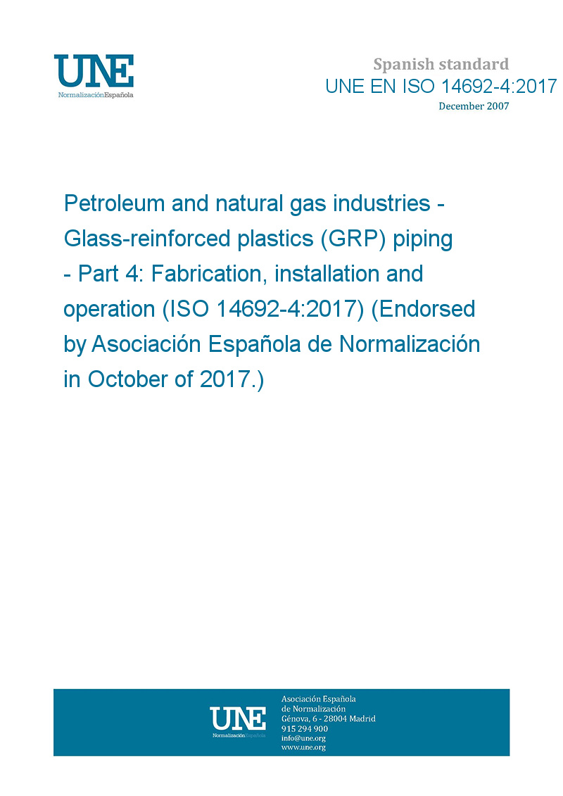 Petroleum and natural gas industries - Glass-reinforced plastics (GRP) piping - Part 4: Fabrication, installation and operation (ISO 14692-4:2017) (Endorsed by Asociación Española de Normalización in October of 2017.)