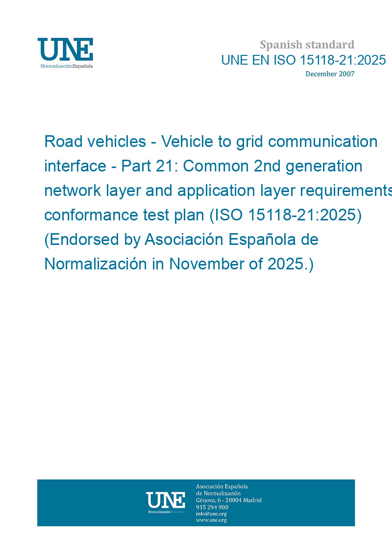 Vehículos de carretera. Interfaz de comunicación entre el vehículo y la red eléctrica. Parte 21: Plan de ensayo de conformidad de los requisitos comunes de la capa de red de segunda generación y de la capa de aplicación (ISO 15118-21:2025) (Ratificada por la Asociación Española de Normalización en noviembre de 2025.)