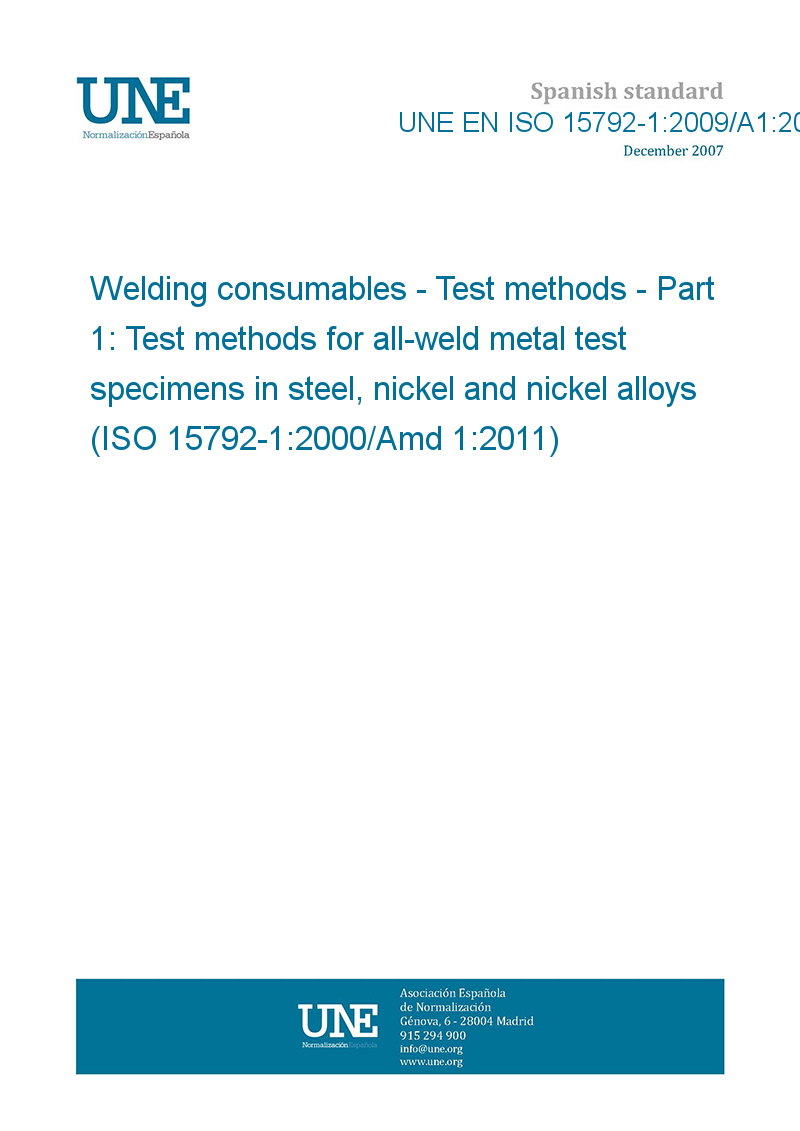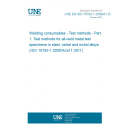 Consumibles para el soldeo. Métodos de ensayo. Parte 1: Método de ensayo para probetas de ensayo de metal de soldadura en acero, níquel y aleaciones de níquel. (ISO 15792-1:2000/Amd 1:2011).