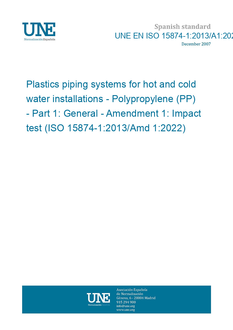 Sistemas de canalización en materiales plásticos para instalaciones de agua caliente y fría. Polipropileno (PP). Parte 1: Generalidades. Modificación 1: Ensayo de impacto. (ISO 15874-1:2013/Amd 1:2022).