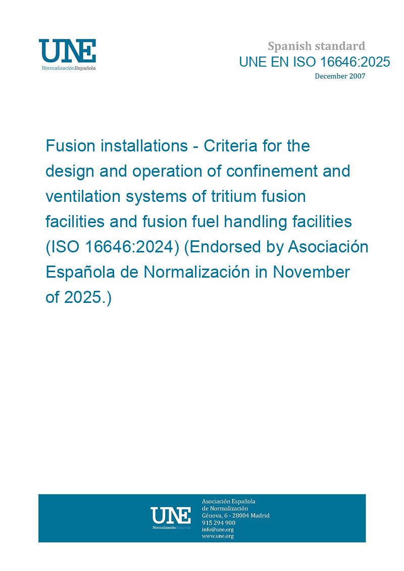 Instalaciones de fusión. Criterios para el diseño y operación de sistemas de confinamiento y ventilación de instalaciones de fusión de tritio e instalaciones de manipulación de combustible de fusión (ISO 16646:2024) (Ratificada por la Asociación Española de Normalización en noviembre de 2025.)