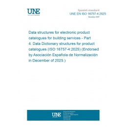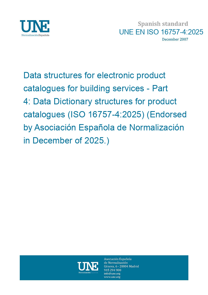 Estructuras de datos para catálogos electrónicos de productos para servicios de construcción. Parte 4: Diccionario de estructuras para catálogo de productos (ISO 16757-4:2025) (Ratificada por la Asociación Española de Normalización en diciembre de 2025.)