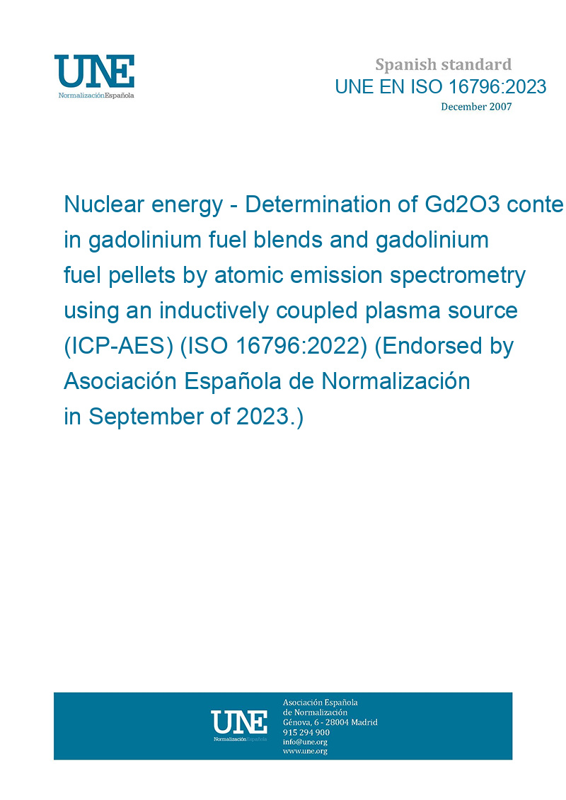 Nuclear energy - Determination of Gd2O3 content in gadolinium fuel blends and gadolinium fuel pellets by atomic emission spectrometry using an inductively coupled plasma source (ICP-AES) (ISO 16796:2022) (Endorsed by Asociación Española de Normalización in September of 2023.)