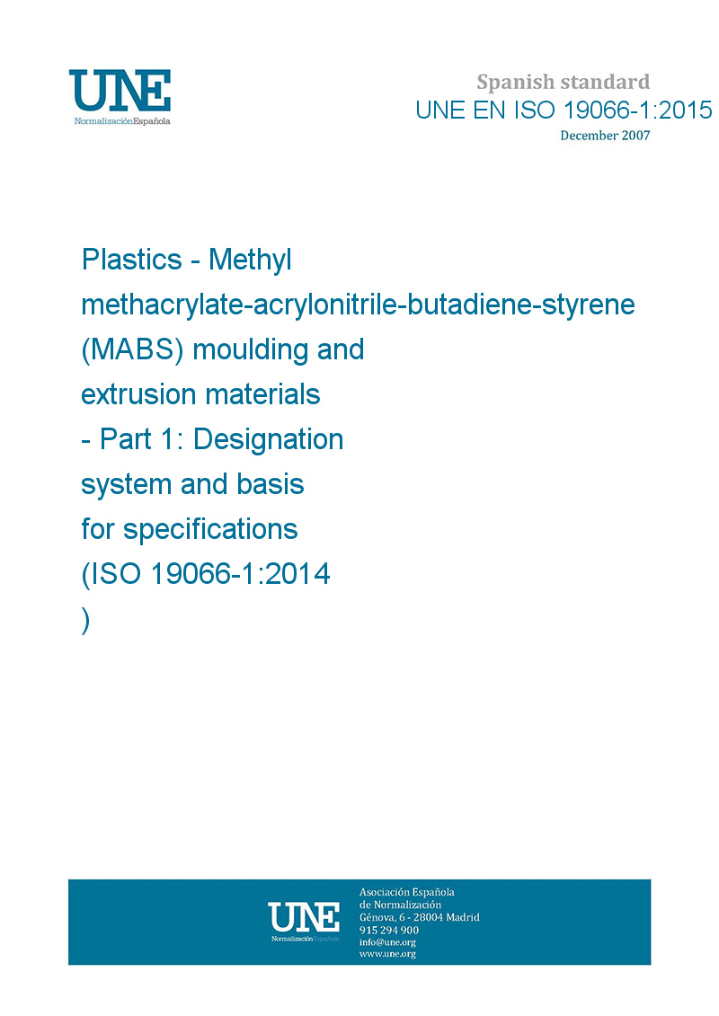 Plásticos. Materiales de metacrilato de metilo-acrilonitrilo-butadieno-estireno (MABS) para moldeo y extrusión. Parte 1: Sistema de designación y bases para las especificaciones. (ISO 19066- 1:2014).