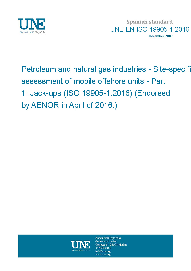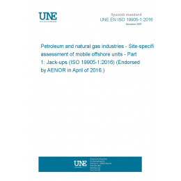 Petroleum and natural gas industries - Site-specific assessment of mobile offshore units - Part 1: Jack-ups (ISO 19905-1:2016) (Endorsed by AENOR in April of 2016.)