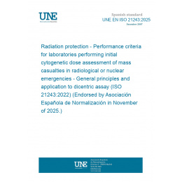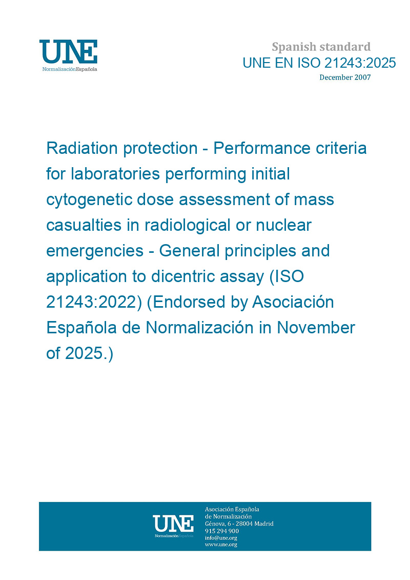 Protección radiológica. Criterios de desempeño para laboratorios que realizan evaluaciones iniciales de dosis citogenéticas de víctimas masivas en emergencias radiológicas o nucleares. Principios generales y aplicación al ensayo de dicéntricos (ISO 21243:2022) (Ratificada por la Asociación Española de Normalización en noviembre de 2025.)