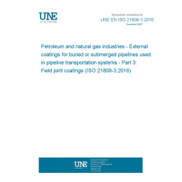 Industrias del petróleo y del gas natural. Recubrimientos externos para tuberías enterradas o sumergidas empleadas en sistemas de transporte por tubería. Parte 3: Revestimientos de las juntas realizados en obra. (ISO 21809-3:2016).
