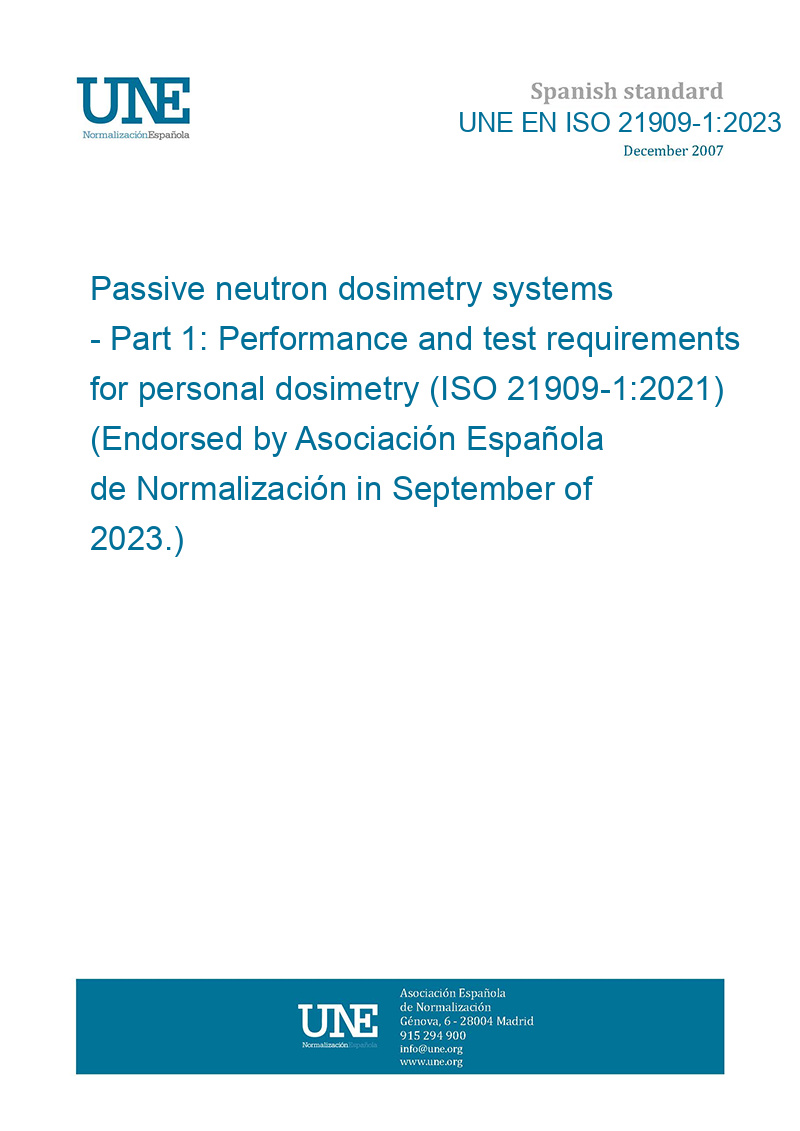 Sistemas de dosimetría de neutrones pasivos. Parte 1: Requisitos de rendimiento y ensayo para dosimetría personal (ISO 21909-1:2021) (Ratificada por la Asociación Española de Normalización en septiembre de 2023.)