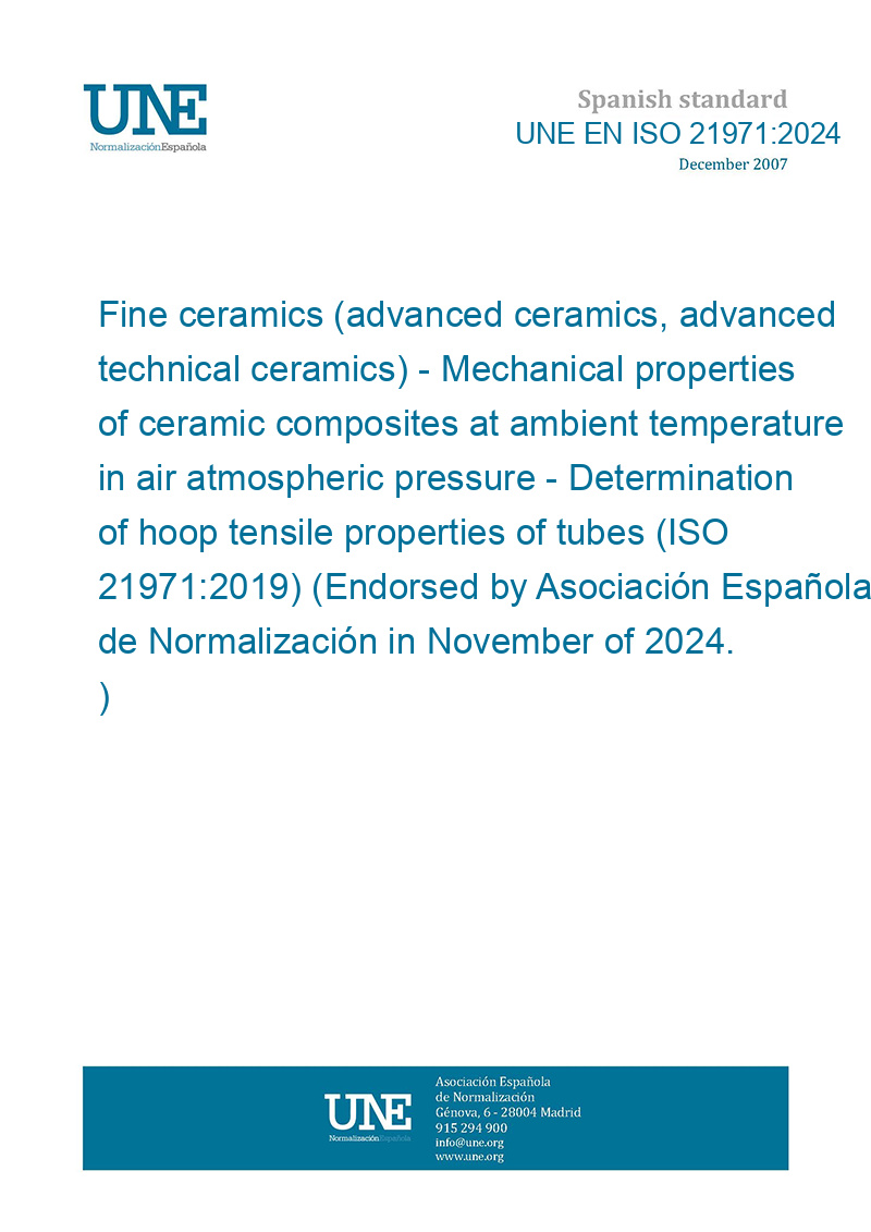 Cerámica fina (cerámicas avanzadas, cerámicas técnicas avanzadas). Propiedades mecánicas de los compuestos cerámicos a temperatura ambiente y presión atmosférica. Determinación de las propiedades de tensión circunferencial de los tubos (ISO 21971:2019) (Ratificada por la Asociación Española de Normalización en noviembre de 2024.)
