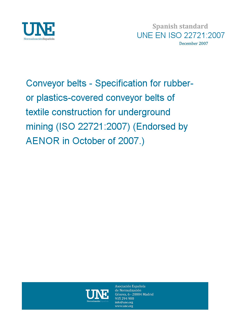 Cintas transportadoras. Especificaciones para cintas transportadoras de estructura textil cubiertas de caucho o plásticos para instalaciones en minas subterráneas (ISO 22721:2007) (Ratificada por AENOR en octubre de 2007.)