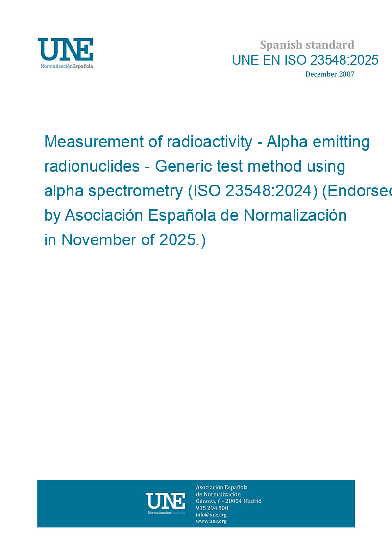 This standard UNE EN ISO 23548:2025 Measurement of radioactivity - Alpha emitting radionuclides - Generic test method using alpha spectrometry (ISO 23548:2024) (Endorsed by Asociación Española de Normalización in November of 2025.) is classified in these ICS categories: