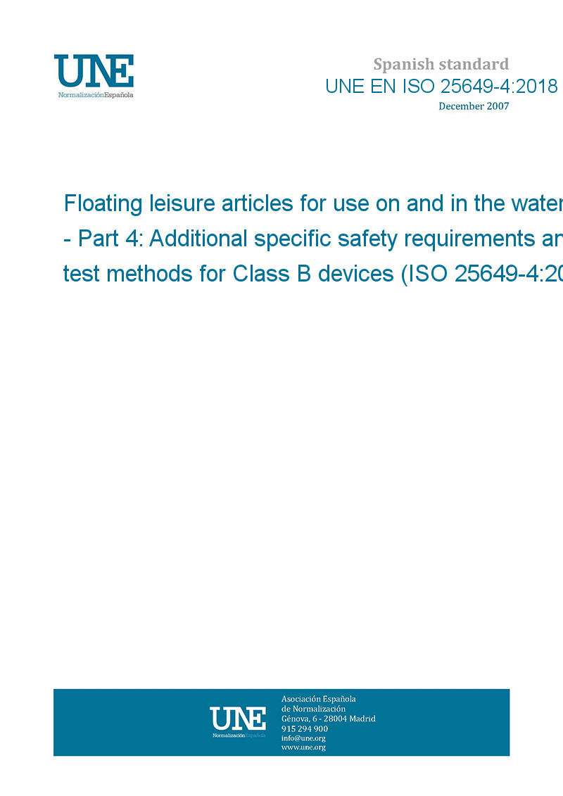 Artículos de recreo flotantes para utilizar sobre y en el agua. Parte 4: Requisitos de seguridad y métodos de ensayo complementarios específicos para equipos de clase B. (ISO 25649-4:2017).