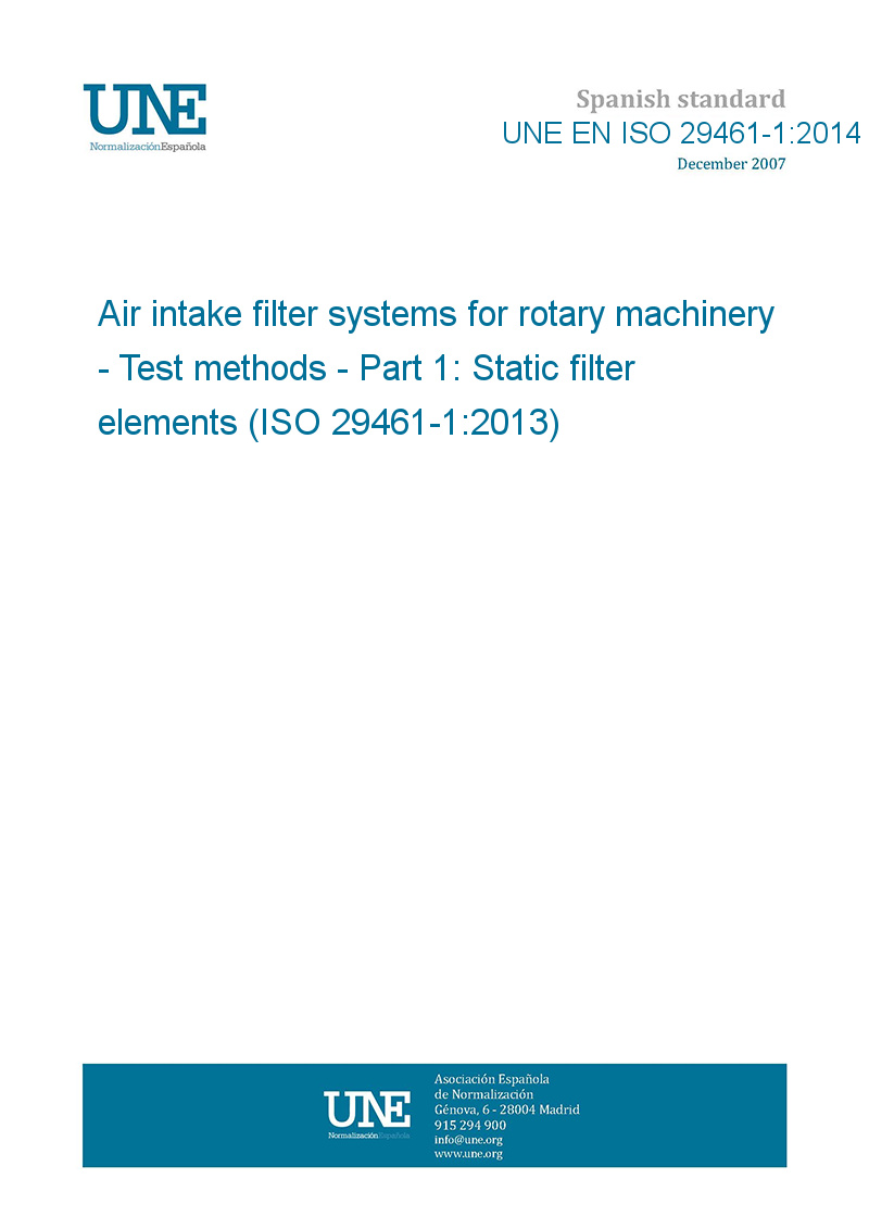 >UNE standards>UNE EN ISO 29461-1:2014 Air intake filter systems for rotary machinery - Test methods - Part 1: Static filter elements (ISO 29461-1:2013)