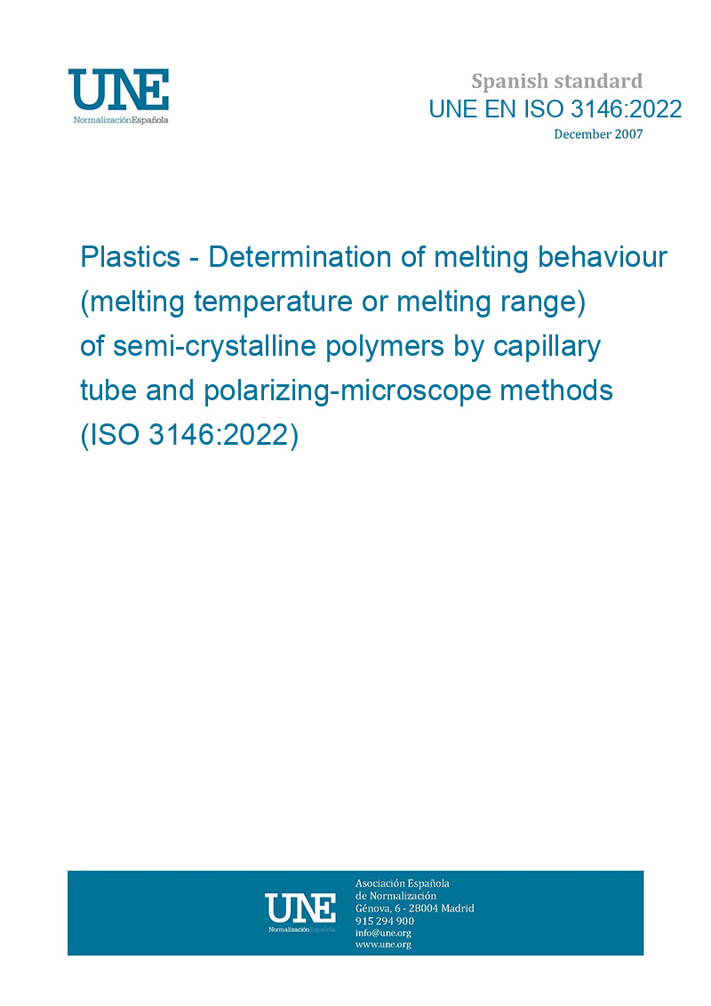 Plásticos. Determinación del comportamiento de fusión (temperatura de fusión o intervalo de fusión) de polímeros semicristalinos mediante los métodos del tubo capilar y del microscopio de polarización. (ISO 3146:2022).