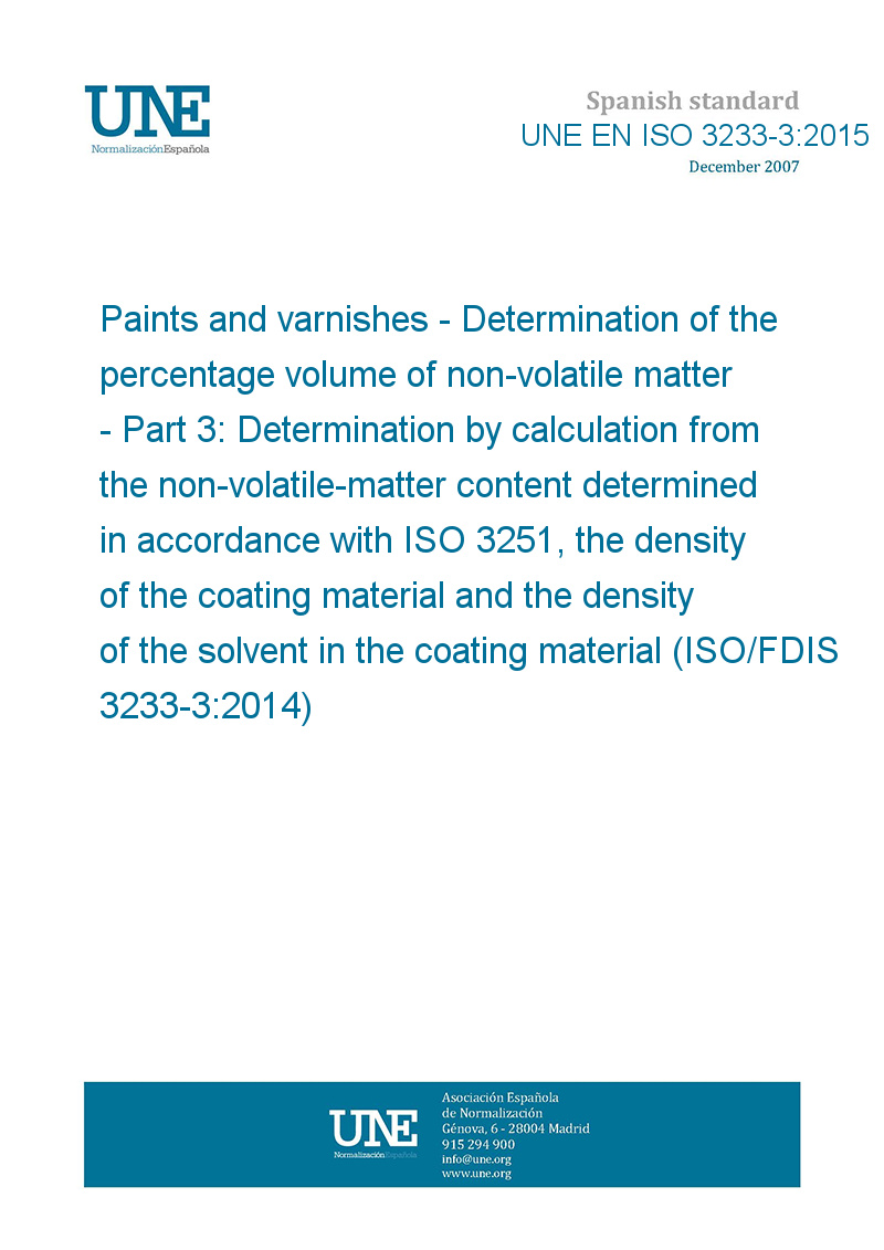 Pinturas y barnices. Determinación del porcentaje en volumen de la materia no volátil. Parte 3: Determinación mediante el cálculo a partir del contenido de materia no volátil conforme a la Norma ISO 3251, la densidad del material de recubrimiento y la densidad del disolvente en el material de recubrimiento. (ISO 3233-3:2015).