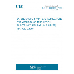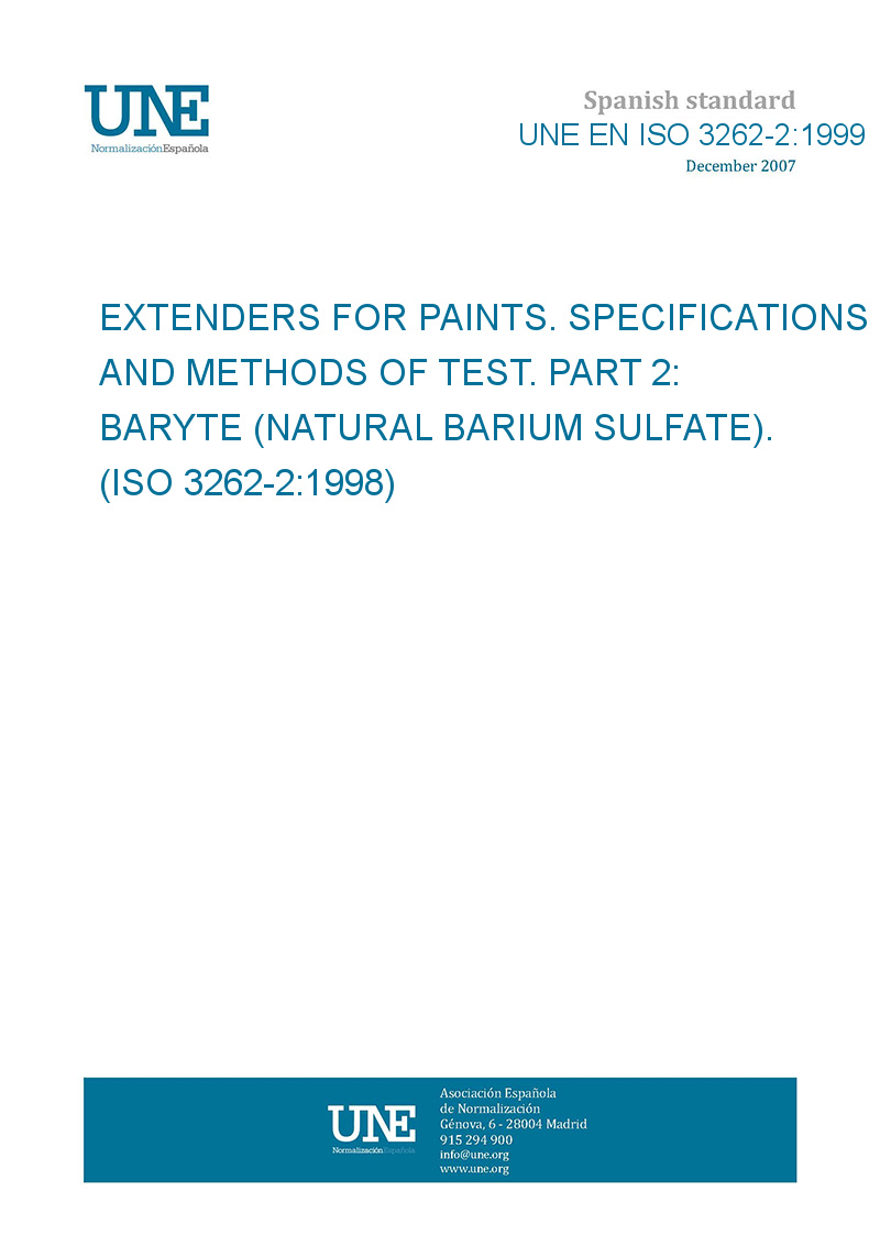 >UNE standards>UNE EN ISO 3262-2:1999 EXTENDERS FOR PAINTS. SPECIFICATIONS AND METHODS OF TEST. PART 2: BARYTE (NATURAL BARIUM SULFATE). (ISO 3262-2:1998)