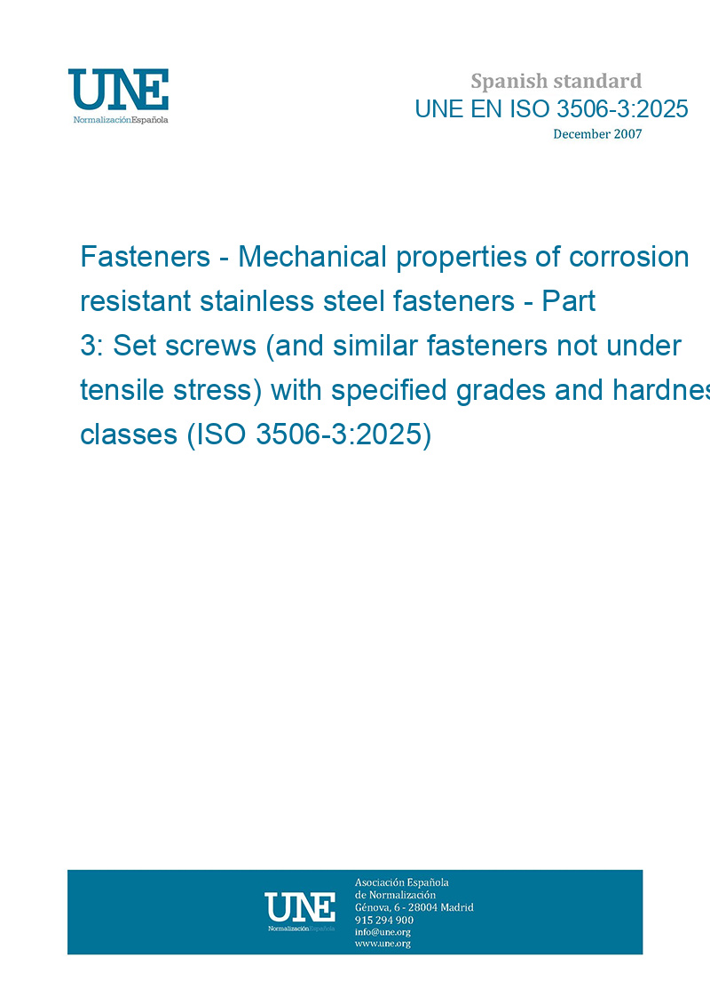 This standard UNE EN ISO 3506-3:2025 Fasteners - Mechanical properties of corrosion resistant stainless steel fasteners - Part 3: Set screws (and similar fasteners not under tensile stress) with specified grades and hardness classes (ISO 3506-3:2025) is classified in these ICS categories: