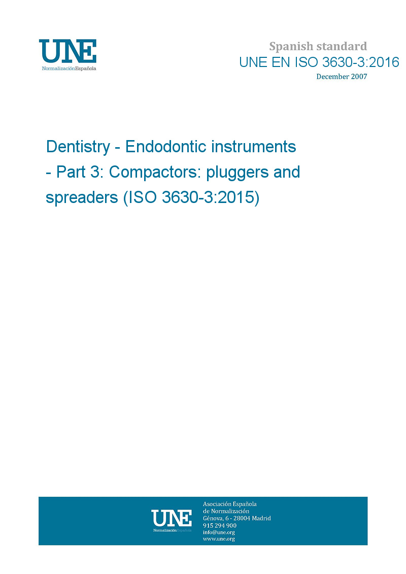 >UNE standards>UNE EN ISO 3630-3:2016 Dentistry - Endodontic instruments - Part 3: Compactors: pluggers and spreaders (ISO 3630-3:2015)