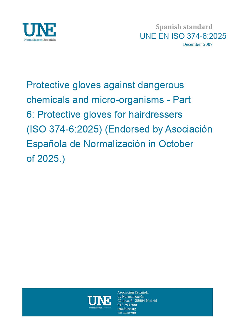 Guantes de protección contra los productos químicos y los microorganismos. Parte 6: Guantes de protección para peluqueros (ISO 374-6:2025) (Ratificada por la Asociación Española de Normalización en octubre de 2025.)
