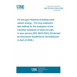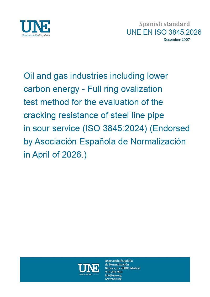 Industrias del petróleo y el gas, incluida la energía con bajas emisiones de carbono. Método de ensayo de ovalización con anillo completo para la evaluación de la resistencia al agrietamiento de tuberías de acero en servicio ácido (ISO 3845:2024). (Ratificada por la Asociación Española de Normalización en abril de 2026.)