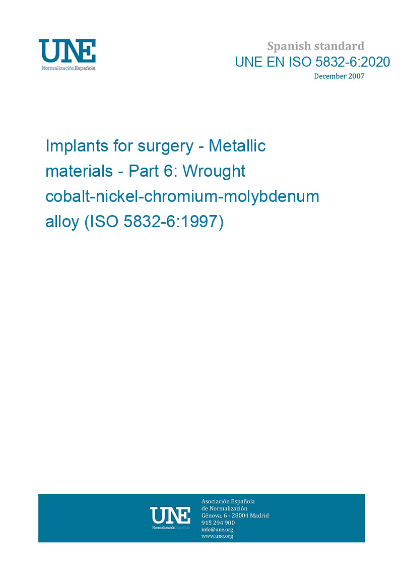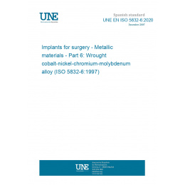 >UNE standards>UNE EN ISO 5832-6:2020 Implants for surgery - Metallic materials - Part 6: Wrought cobalt-nickel-chromium-molybdenum alloy (ISO 5832-6:1997)