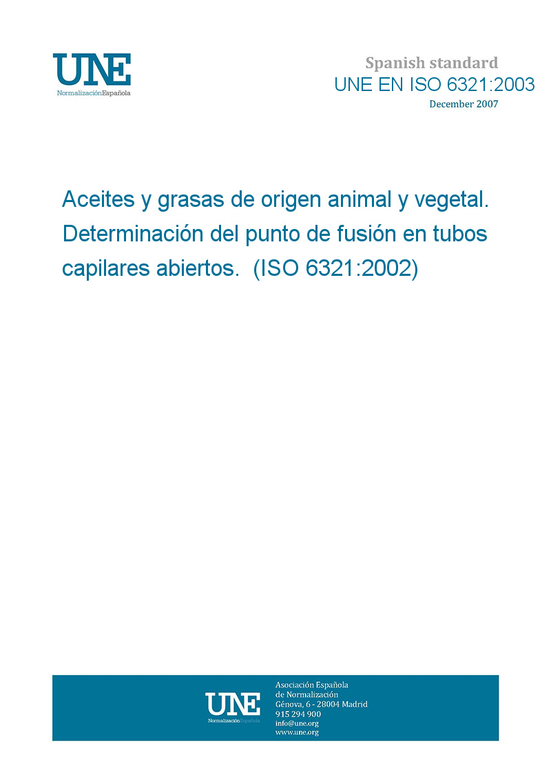 >UNE standards>UNE EN ISO 6321:2003 Animal and vegetable fats and oils - Determination of melting point in open capillary tubes (slip point) (ISO 6321:2002)