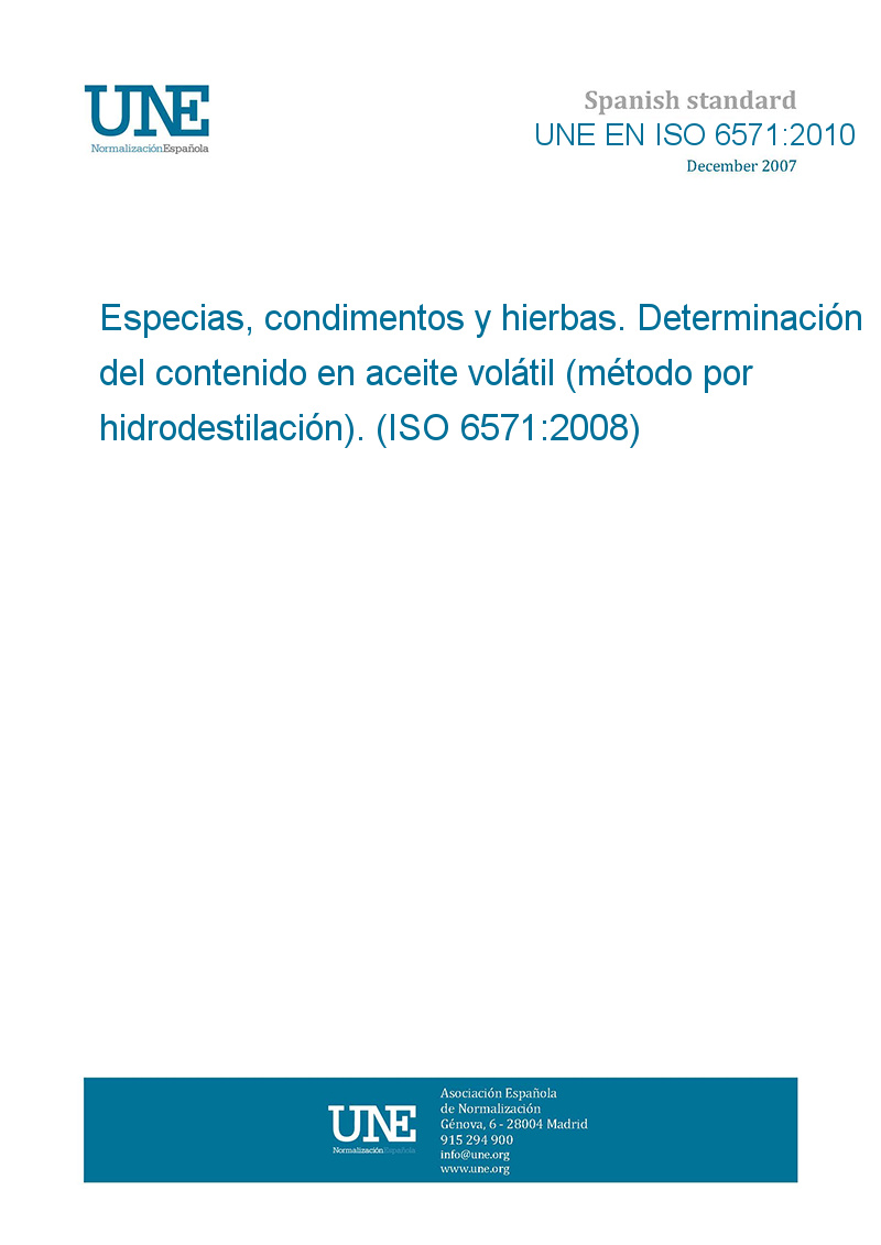Especias, condimentos y hierbas. Determinación del contenido en aceite volátil (método por hidrodestilación). (ISO 6571:2008)
