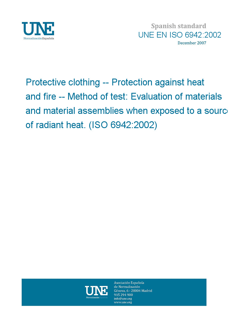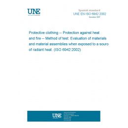 UNE EN ISO 6942:2002 Protective clothing -- Protection against heat and fire -- Method of test: Evaluation of materials and material assemblies when exposed to a source of radiant heat. (ISO 6942:2002)