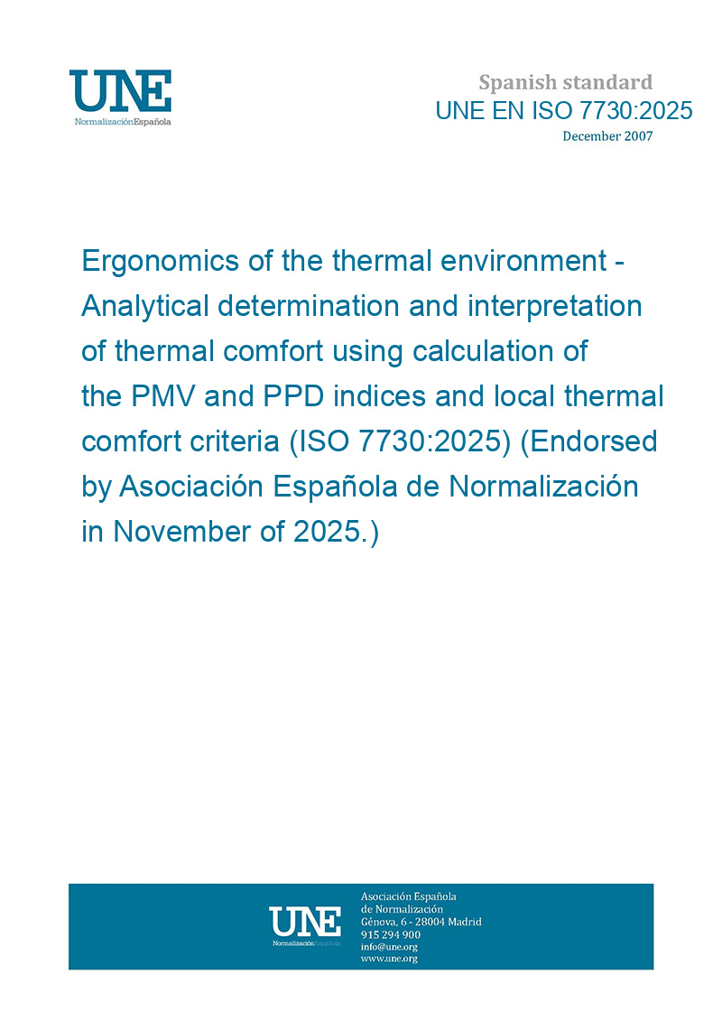 Ergonomics of the thermal environment - Analytical determination and interpretation of thermal comfort using calculation of the PMV and PPD indices and local thermal comfort criteria (ISO 7730:2025) (Endorsed by Asociación Española de Normalización in November of 2025.)