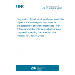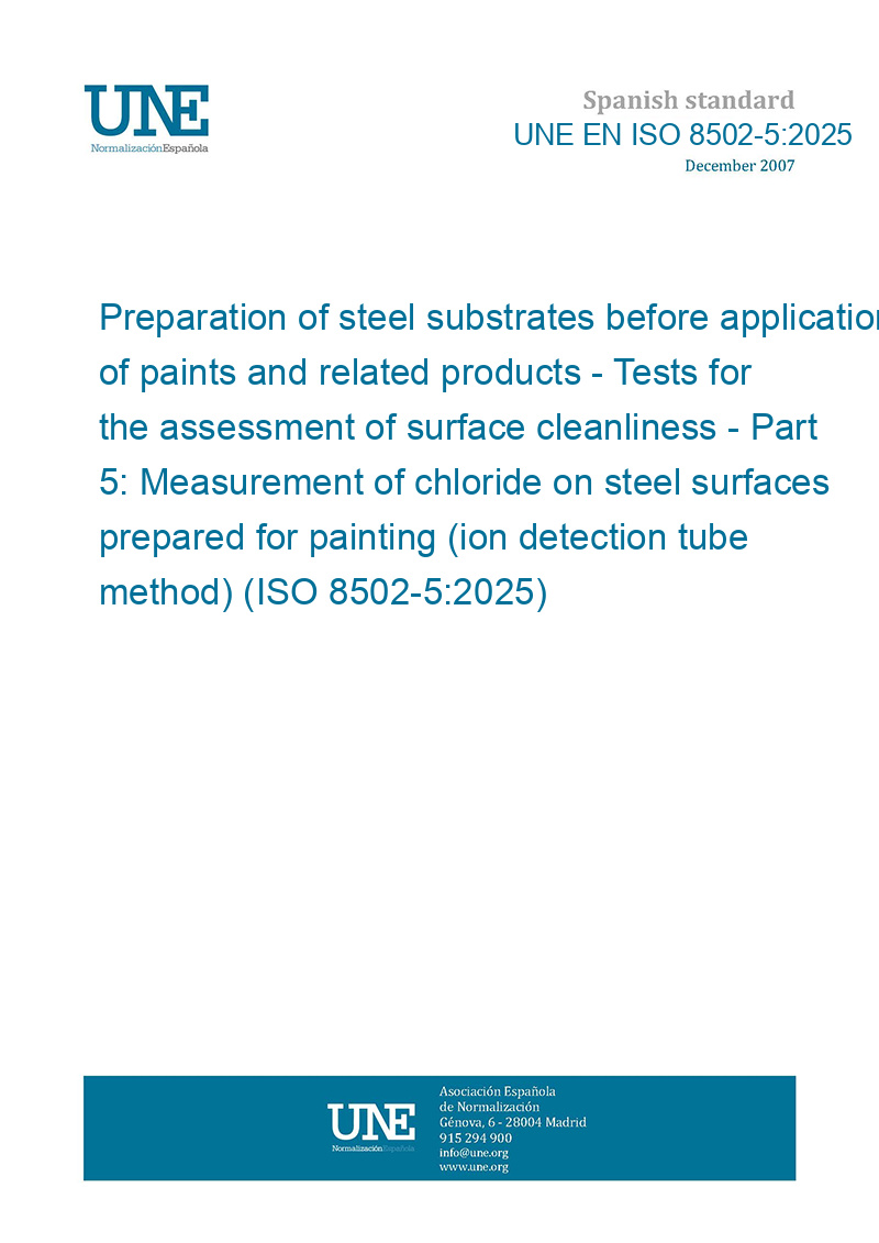 Preparación de sustratos de acero previa a la aplicación de pinturas y productos relacionados. Ensayos para la evaluación de la limpieza de las superficies. Parte 5: Medición de cloruros en superficies de acero preparadas para pintar (método del tubo detector de iones). (ISO 8502-5:2025).