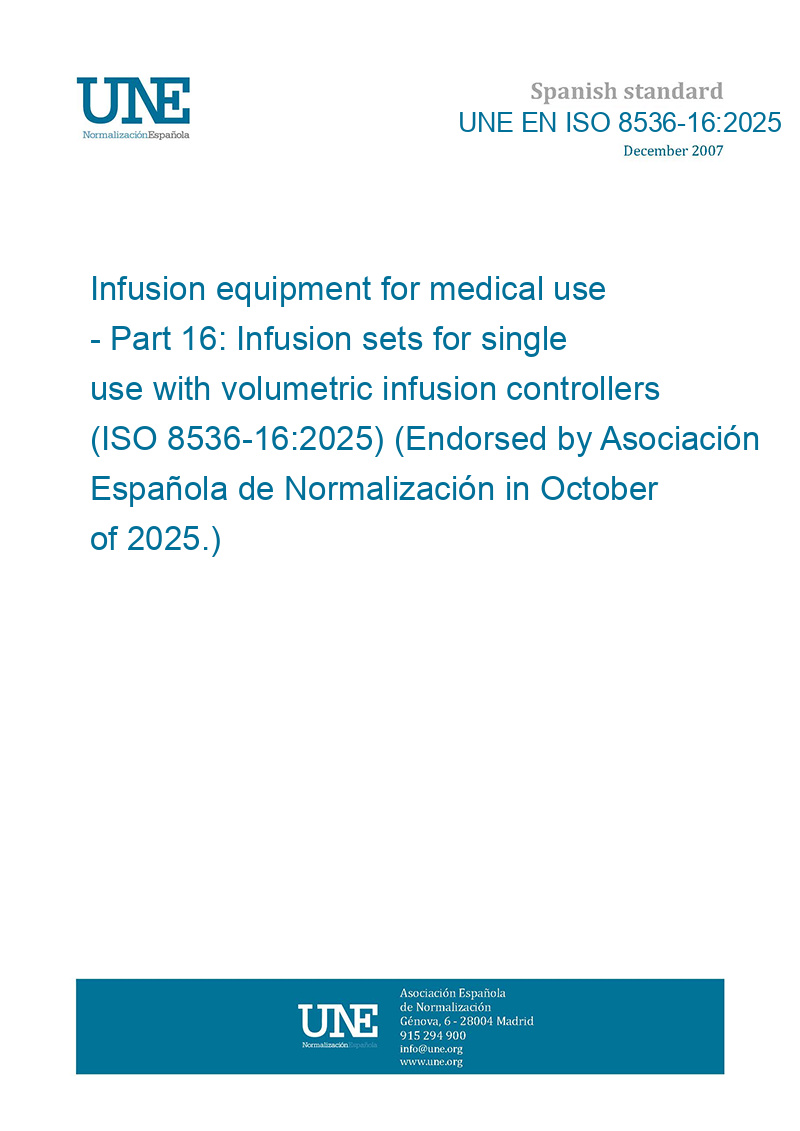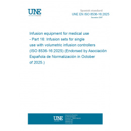 Equipo de infusión para uso médico. Parte 16: Equipos de infusión de un solo uso con controladores de infusión volumétricos (ISO 8536-16:2025) (Ratificada por la Asociación Española de Normalización en octubre de 2025.)