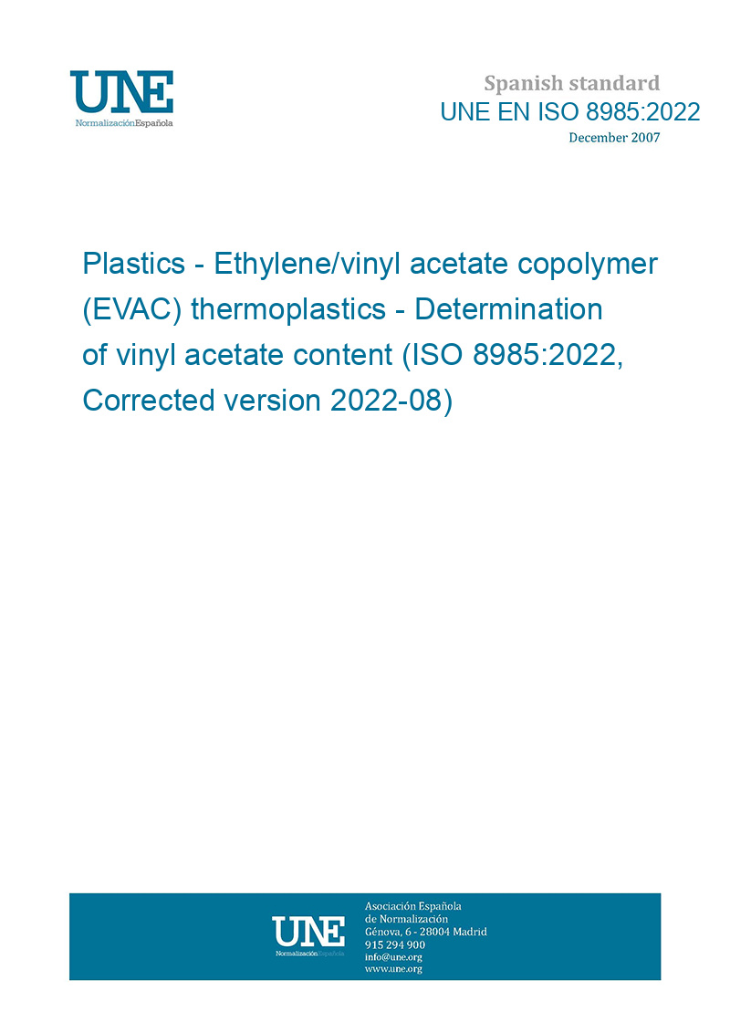 Plásticos. Termoplásticos de copolímeros de etileno/acetato de vinilo (EVAC). Determinación del contenido de acetato de vinilo. (ISO 8985:2022, Versión corregida 2022-08).