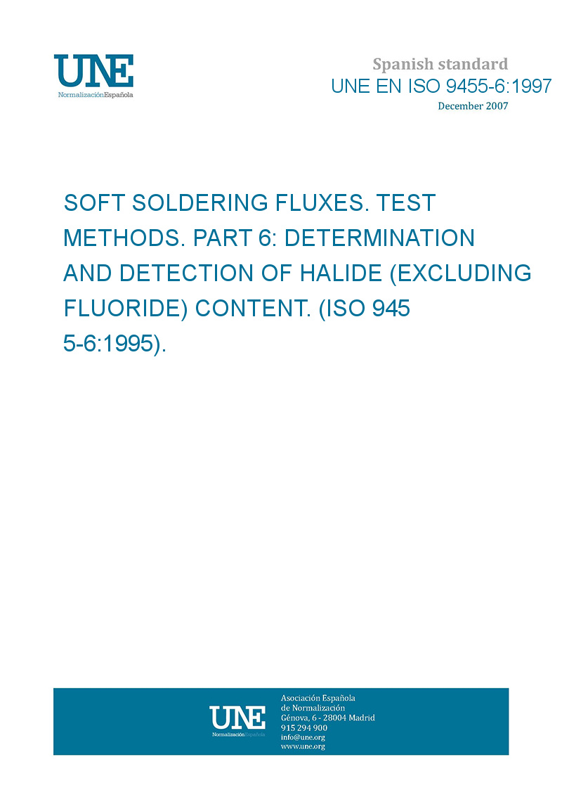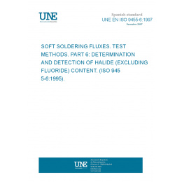 >UNE standards>UNE EN ISO 9455-6:1997 Soft soldering fluxes - Test methods - Part 6: Determination and detection of halide (excluding fluoride) content (ISO 9455-6:1995)